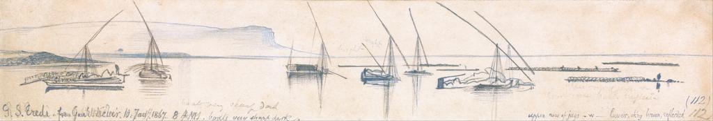 | Keywords: Edward Lear - Gebel Sheikh Eredi from Gau el Kebir - Google Art Project.jpg inscribed in blue ink over graphite lower left G S Eredi from Gau el Kebir 10 Jany 1867 8 AM boats very sharp dark ; in blue ink lower right upper row of jugs - w - lower ok'ry brown reflected 112 ; Verso in graphite upper left 27 up next below top ; in braphite center right 109 Not on View Pen in blue and gray ink with white gouache over graphite on moderately thick slightly textured cream wove paper water river landscape marine art boats special url_id OwHN0kF-zAJqUA PD-old-100-1923 1888 Egypt by Edward Lear Nile in art Google Art Project works by Edward Lear Egyptian feluccas in art |