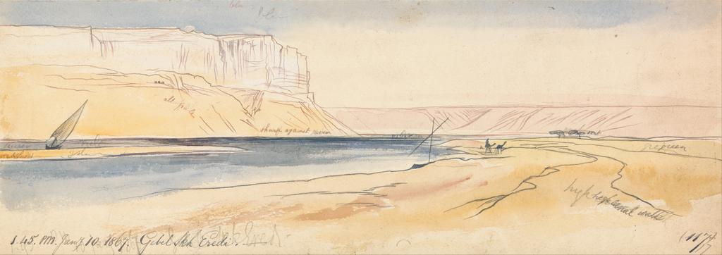 | Keywords: Edward Lear - Gebel Sheikh Eredi - Google Art Project (2314402).jpg inscribed in blue ink lower left 1 45 PM Jany 10 1867 Gebel skh Eredi ; in bllue ink lower right 117 ; Verso in graphite upper left 28 up Top Not on View Watercolor with pen in blue and cochineal over graphite on moderately thick moderately textured beige wove paper camels mammals sand water cliffs river sail figures representations landscape boat special url_id twEzwEyxp9FLAw PD-old-100-1923 1888 Egypt by Edward Lear Nile in art Google Art Project works by Edward Lear |