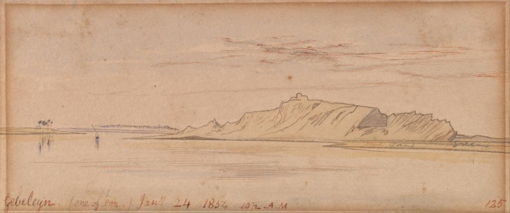 Keywords: Edward Lear - Gebelein - Google Art Project (2397451).jpg inscribed in brown ink over graphite lower left Gebeleyn one of em Janr 24 1854 10 2 AM ; in brown-red ink lower right 125 ; Verso inscribed in black ink center 26 next below upper ; in graphite lower center 90 Not on View Watercolor with pen in brown ink over graphite on moderately thick rough brown wove paper sky water river mountains landscape boat special url_id tgGYrFmSVGiM2w PD-old-100-1923 1888 Egypt by Edward Lear Google Art Project works by Edward Lear Gebelein 1854 in Egypt |