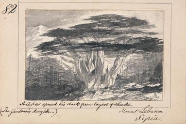 | Keywords: Edward Lear - Illustration to Tennyson's "The Gardener's Daughter-" Mount Lebanon, Syria - `A Cedar spread his dar... - Google Art Project.jpg inscribed in black ink on mount upper left 82 ; inscribed in black ink on mount lower left A Cedar spread his dark green layers of shade The Gardener's daughter Mount Lebanon Syria ; Verso in graphite upper left 1880 ; in graphite upper right 27 Not on View Pen in black and gray ink with gray wash on moderately thick moderately textured cream wove paper sky cedar tree landscape special url_id gwEYUFDaCsF_yw PD-old-100-1923 1888 Drawings by Edward Lear Cedrus libani illustrations Cedrus libani var libani historical images Mount Lebanon Google Art Project works by Edward Lear Mount Lebanon Mutasarrifate |