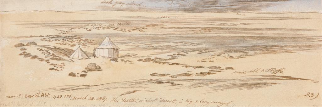 | Keywords: Edward Lear - Near Beer El Abt, 4-30 pm, 28 March 1867 (23) - Google Art Project.jpg inscribed in brown ink lower left near Beer El Abt 4 30 PM March 28 1867 This little or short desert is big long enough ; in brown ink lower right 23 ; Verso in graphite upper left 172 up Lowest Not on View Watercolor with pen in brown ink over graphite on thick rough cream wove paper clouds sky sand tents landscape desert special url_id lgGLQsnOj-stEg PD-old-100-1923 1888 Egypt by Edward Lear Google Art Project works by Edward Lear |