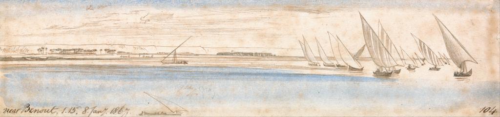 | Keywords: Edward Lear - Near Benout - Google Art Project.jpg inscribed in brown ink lower left Near Benout 1 15 8 Jany 1867 ; in brown ink lower right 104 ; Verso in graphite upper left 25 up Lowest ; in graphite center right 103 Not on View Watercolor with pen in brown ink over graphite on moderately thick moderately textured beige wove paper sky water river sails landscape marine art boats special url_id GgFbNSr9b-z6sQ PD-old-100-1923 1888 Egypt by Edward Lear Google Art Project works by Edward Lear |