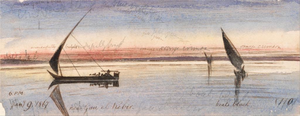 | Keywords: Edward Lear - Near Gau el Kebir - Google Art Project.jpg inscribed in brown ink lower left 6 PM Jany 9 1867 near Gau el Kebir ; in brown ink lower right 110 ; Verso in graphite center 107' Not on View Watercolor with pen in brown ink over graphite on medium slightly textured wove paper mounted on thick moderately textured cream wove paper sky water river sails marine art boats special url_id cQG6_VSkfuuIJA PD-old-100-1923 1888 Egypt by Edward Lear Google Art Project works by Edward Lear Egyptian feluccas in art |