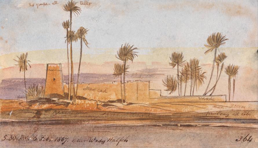 | Keywords: Edward Lear - Near Wady Halfeh - Google Art Project.jpg inscribed in brown ink lower left 5 30 PM 6 Feby 1867 near Wady Halfeh ; in brown ink lower right 364 ; Verso in graphite upper center 220 up 97 next below A Not on View Watercolor witih pen in brown ink over graphite on medium slightly textured beige wove paper sky palm trees sand lake river structure single built work genre subject special url_id GQFtgw4UGbN4AA PD-old-100-1923 1888 Egypt by Edward Lear Google Art Project works by Edward Lear Wadi Halfa Nubia in art |