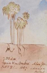 | Keywords: Edward Lear - Opposite Kom Ombos Abu Jer - Google Art Project.jpg inscribed in brown ink lower left 7 50 AM Opposite Kon Ombos Abou Jer Feby 2 __1867 dans in Palms ; Verso in graphite center 148 up Top right Not on View Watercolor with pen in brown ink over graphite on medium slightly textured cream wove paper palm trees study visual work genre subject special url_id IAHJ7sZJxGx3CA PD-old-100-1923 1888 Egypt by Edward Lear Google Art Project works by Edward Lear | ||||