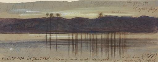 | Keywords: Edward Lear - Philae, 6-00-6-15 am, 31 January 1867 (277) - Google Art Project.jpg  Inscribed in brown ink lower left 6-6 15 AM 31 Jany 1867 hills very dark water darkly blue black hair palms feather like 277 black ; in brown ink upper right blue green gray blue green gray Not on View Watercolor with pen in brown ink over graphite on moderately thick moderately textured gray wove paper reflection sunrise palm trees water river landscape special url_id XwE5Owv5vdePEw PD-old-100-1923 1888 Egypt by Edward Lear Philae in art Google Art Project works by Edward Lear |