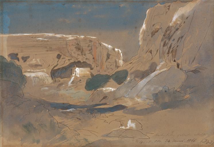 | Keywords: Edward Lear - Rocky Valley of Mosta, Malta - Google Art Project.jpg in brown ink lower right Rocky Valley of Musta Malta 4 -5-PM 24 March 1866 242 Not on View Watercolor with pen in brown ink over graphite with gouache white gouche and blue chalk on moderately thick slightly textured beige wove paper mounted on medium slightly textured brown wove paper sky bushes rocks cliffs valley landform structure single built work landscape special url_id cgE-Ox4DgxI9tg PD-old-100-1923 1888 Malta by Edward Lear Google Art Project works by Edward Lear 1866 in Malta Mosta Valley |