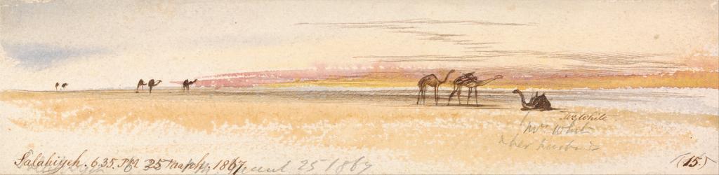 Keywords: Edward Lear - Salahiyeh - Google Art Project (2314769).jpg inscribed in brown ink lower left Salahiyeh 6 35 PM 25 March 1867 ; in brown ink lower right 15 ; Verso in graphite upper right 356 Not on View Watercolor with pen in brown ink over graphite on wove paper on thick rough cream wove paper sky camels mammals sand landscape special url_id 1gEbyReaQcD-6Q PD-old-100-1923 1888 Egypt by Edward Lear Google Art Project works by Edward Lear History of Syria