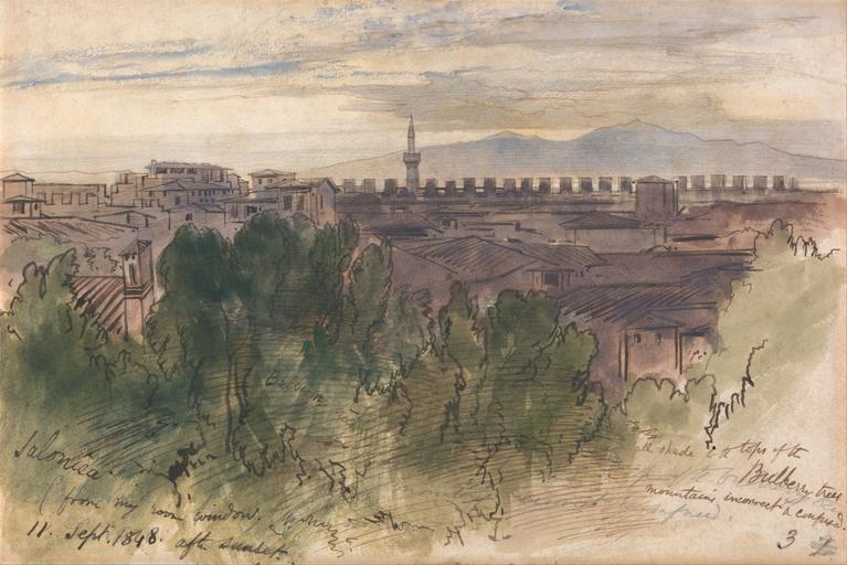 Keywords: Edward Lear - Salonica, from my Room Window, 11 Sept. 1848, after Sunset - Google Art Project.jpg Inscribed in pen in brown ink lower left Salonica from my room window 11 Sept 1848 after sunset ; pen in brown ink lower right all shade illeg tops of the Bulberry trees mountains incorrect a confused 3 ; in graphite lower right crossed out in graphite 2 ; verso in graphite lower center 0757 Not on View Watercolor with pen in brown ink over graphite on medium slightly textured cream wove paper sky windows minaret mountains trees buildings cityscape special url_id ZwETLoftVTlDTw PD-old-100-1923 1888 Watercolor paintings by Edward Lear Google Art Project works by Edward Lear |