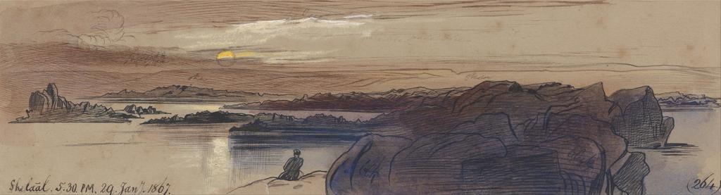 | Keywords: Edward Lear - Shelaal, 5-30 am, 29 January 1867 (264) - Google Art Project.jpg inscribed in black ink lower left Shelaal 5 30 PM 29 Jany 1867 ; in black ink lower right 264 ; Verso in graphite upper left 72 up; in graphite center next below Top Not on View Watercolor with pen in black ink and gouache over graphite on moderately thick moderately textured gray wove paper sunset rocks water river riverbank figure representation landscape special url_id dAGfOrSPF55wqQ PD-old-100-1923 1888 Egypt by Edward Lear Google Art Project works by Edward Lear |