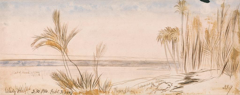 | Keywords: Edward Lear - Wady Halfeh - Google Art Project.jpg inscribed in brown ink lower left Wady Halfeh 5 30 PM Febr 3 1867 ; in brown ink lower right 339 ; Verso in graphite center 85 up Lowest ; in graphite upper right; 211 Not on View Watercolor with pen in brown ink over graphite on moderately thick slightly textured cream wove paper sky palm trees sand water lake river landscape special url_id xwEEfVGA9-vVzg PD-old-100-1923 1888 Watercolor paintings by Edward Lear Nubia in art Nile in art Google Art Project works by Edward Lear Wadi Halfa |