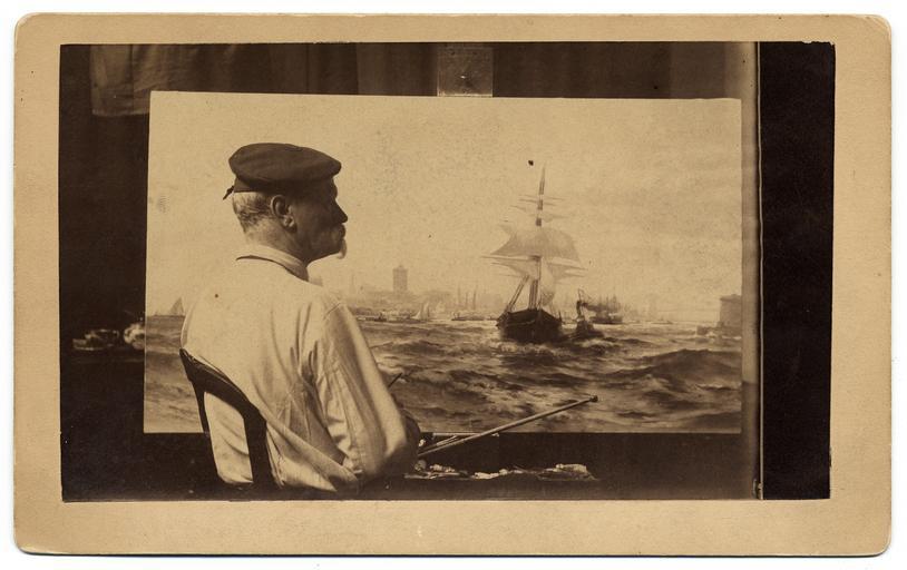 | Keywords: smithsonian institution smithsonianinstitution portrait edward moran edwardmoran painter marine seascape painting sailing ship sailingship working artist workingartist painter at work painteratwork barco pintor retrato beret archives of american art archivesofamericanart picture frame Description: Moran seated in a side pose in front of a work in progress. Photographer unidentifed. Moran was a marine painter, New York, N.Y.  Creator/Photographer: Unidentified photographer  Medium: Black and white photographic print  Dimensions: 12 cm x 19 cm  Date: c. 1870  Persistent URL: www.aaa.si.edu/collections/images/detail/edward-moran-pai...  Repository: Archives of American Art  Accession number: AAA_miscphot_5622 Description: Moran seated in a side pose in front of a work in progress. Photographer unidentifed. Moran was a marine painter, New York, N.Y.  Creator/Photographer: Unidentified photographer  Medium: Black and white photographic print  Dimensions: 12 cm x 19 cm  Date: c. 1870  Persistent URL: www.aaa.si.edu/collections/images/detail/edward-moran-pai...  Repository: Archives of American Art  Accession number: AAA_miscphot_5622 |