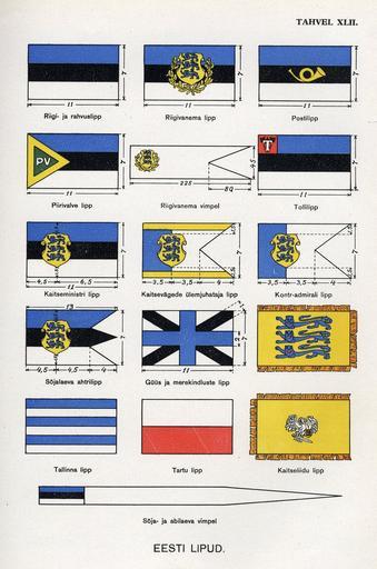 | Keywords: Eesti lipud EE.jpg Eesti Entsüklopeedia 1933 Första raden Stats- och nationsflagga - Riksäldstens flagga - Postflagga Andra raden Gränsbevakningens flagga - Riksäldstens vimpel - Tullflagga Tredje raden Försvarsministerns flagga - Försvarsmaktens överbefälhavares flagga - Konteramiralsflagg Fjärde raden Örlogsflagga - Örlogsgös samt fästningsflagga - Kaitseliits den estniska skyddskåren flagga åtsida Femte raden Tallinns flagga - Tartus flagga - Kaitseliits flagga frånsida Sjätte raden Örlogs- och båtvimpel PD-old PD-EE-exempt flags Extracted versions <gallery caption Extracted of vector versions of the same flags > File Flag of Estonia svg Riigi- ja rahvuslipp / State and national flag File Presidential Flag of Estonia svg Riigivanema lipp / Presidential flag File Flags of Estonia - Postal Flag svg Postilipp / Postal flag File Flags of Estonia - Border Guards svg Piirivalve lipp / Border Guard Flag File Flags of Estonia - Presidential pennant svg Riigivanema vimpel / Presidential pennant File Flags of Estonia - Customs Flag gif Tollilipp / Customs Flag File Flags of Estonia - Minister of Defence svg Kaitseministri lipp / Minister of Defence flag File Flags of Estonia - Commander-in-Chief svg Kaitsevägede ülemjuhataja lipp / Commander-in-Chief flag File Flags of Estonia - Rear Admiral svg Kontr-admirali lipp / Rear Admiral flag File Naval Ensign of Estonia svg Sõjalaeva ahtrilipp / Naval Ensign File Naval Jack of Estonia svg Güüs ja merekindluste lipp / Naval Jack File Kaitseliit flag - obverse jpg Kaitseliidu lipp / Defence League flag File Flag of Tallinn svg Tallinna lipp / Flag of Tallinn File Tartu flag svg Tartu lipp / Flag of Tartu File Kaitseliit flag - reverse jpg Kaitseliidu lipp / Defence League flag File Flags of Estonia - Masthead Pennant svg Sõja- ja abilaeva vimpel / War and auxiliary pennant </gallery> Eesti Entsüklopeedia 1932-1937 Flags of Estonia Flag charts |