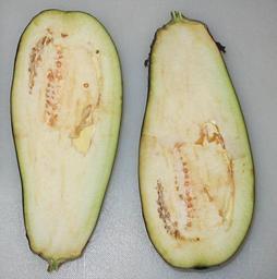 Keywords: Eggplant-sliced.jpg An eggplant probably Solanum melongena sliced in half with the insides facing up on a cutting board Although taken just a few moments after slicing the flesh of the eggplant has already begun to oxidize a little Although much of the flesh is smooth many seeds can be seen at the widest part of the eggplant In the eggplant there are almost no seeds at the top but they become plentiful at the bottom Source My kitchen self-made Photographer/Painter Kit O'Connell Todfox 08 04 13 December 2005 UTC Eggplant Photos by Todfox 2005-12-13 own assumed Todfox~commonswiki Cross sections of vegetables |