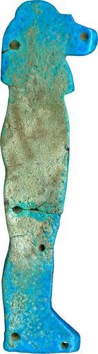 Keywords: Egyptian - Amuletic Figure of Hapy, Son of Horus - Walters 481641 - Reverse.jpg This faience amulet represents Hapy the baboon-headed son of Horus There are four sons of Horus and this amulet is part of a set of four Walters 48 1638-1641 The sons of Horus protected he vital organs of the body after mummification The image is that of a baboon-headed mummiform human The figure faces proper right It is composed of blue glazed faience with the details picked out in purple/black manganese The figure wears a tripartite wig but unlike the other three in this set he does not wear a broad collar There are five diagonal stripes of manganese across the mummiform body representing the mummy wrappings or braces A horizontal fracture at knee level separated the amulet into two fragments which have since been reattached Numerous funerary amulets were usually placed among the many layers of linen strips used to wrap mummies Specific amulets along with their required position on the body are listed in funerary texts such as The Book of the Dead Amulets were sometimes sewn directly onto the wrappings or could be incorporated into a bead net shroud covering the mummy These amulets have been modeled with a flat underside and are pierced by tiny holes around the edges for attachment ca 750 650 BC Third Intermediate Egyptian faience with blue and black glaze cm 9 2 5 0 7 accession number 48 1641 4506 Henry Walters Baltimore date and mode of acquisition unknown Walters Art Museum Henry Walters Acquired by Henry Walters Jewelry - Ancient to Modern The Walters Art Gallery Baltimore 1979-1980 Objects of Adornment Five Thousand Years of Jewelry from the Walters Art Gallery Baltimore Cooper-Hewitt National Design Museum New York; Chrysler Museum of Art Norfolk; Carnegie Museum of Art Pittsburgh; San Antonio Museum of Art San Antonio; Philbrook Museum of Art Tulsa; Honolulu Academy of Arts Honolulu; New Orleans Museum of Art New Orleans; Milwaukee Art Museum Milwaukee; Minneapolis Institute of Arts Minneapolis; Toledo Museum of Art Toledo; The John and Mable Ringling Museum of Art Sarasota 1984-1987 Jewelry from the Walters Art Museum and the Zucker Family Collection The Walters Art Gallery Baltimore 1987 Faience The Colors of the Heavens The Walters Art Museum Baltimore; The Walters Art Museum Baltimore 2003-2004 place of origin Egypt Walters Art Museum license Ancient Egyptian amulets in the Walters Art Museum Hapi Ancient Egyptian faience in the Walters Art Museum Media contributed by the Walters Art Museum needs category review