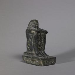 Keywords: Egyptian - Block Statue of Kha-em-Waset - Walters 2268 - Three Quarter.jpg This piece is a small serpentine New Kingdom block statue of Kha-em-Waset Kha-em-Waset was a noble who held the titles of Fan-Bearer and Chief of Works in the Temple of Amun This statue would have been placed as a votive in the temple of Amun Kha-em-Waset sits with his knees drawn up upon a rectangular bench which in turn rests upon a rectangular base The back right corner of the base is missing There is a rectangular back plinth behind him He wears a long smooth ankle-length garment The outlines of his legs are visible in profile and his arms are visible within the garment as well His arms are folded and hands rest flat upon his upper arms An insignia on his upper right arm identifies him as belonging to the Temple of Amun There are two vertical columns of hieroglyphics text on the front of his garment and on the back plinth A single horizontal band of text surrounds the base His wig is a New Kingdom combination of delicate wavy strands over plaited curls His eyes are large and recall the orientalized almond-shaped eyes of Amenhotep III His lips are thick and form a slight smile His ears are unusually pointed He has a short squared beard ca 1370 1360 BC New Kingdom black serpentine cm 8 6 4 1 6 1 accession number 22 68 17604 Dikran Kelekian New York and Paris Henry Walters Baltimore date of acquisition unknown by purchase Walters Art Museum Henry Walters Acquired by Henry Walters Translation All things which go forth on the offering table of Amun lord of coolness and dryness for the fan-bearer Kha-em-Waset; Translation The true admirable one of good character of kindly manners who is not negligent the fan bearer of the troop Beautiful is the yeomanry Kha-em-Waset; Translation An offering which the king gives to Amun-Re King of the gods that he may give a good life to him who is devoted to him and puts himself upon his face the fan-bearer Kha-em-Waset An offering which the king gives to Amun-Re lord of coolness and dryness that he may give a good life in following him until he reaches the age in goodness to the fan-bearer Kha-em-Waset //// the Chief of the works in the Temple of Amun Mark Temple of Amun place of origin Temple of Amun-Re in Karnak Egypt Walters Art Museum license Ancient Egyptian block statues in the Walters Art Museum Statues of the 19th dynasty of Egypt Statues from Karnak temple complex |