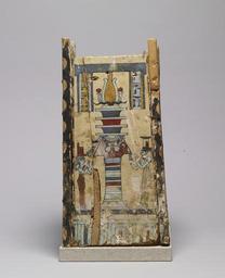 | Keywords: Egyptian - Box for Ushabtis or Canopic Jars - Walters 626 - Side C.jpg During the New Kingdom ushabti figures were often placed in a painted wooden box shaped like a shrine Only the sides of this box are preserved and it may have held a number of ushabti figures or a set of canopic jars The deities associated with death and the afterlife are represented on the box's panels There is the figure of a jackal on top of a shrine which represents the embalming god Anubis Isis and Nephthys flank the large symbol of Osiris and the four sons of Horus All of the inscriptions are related to the god Osiris ca 850 700 BC Third Intermediate wood with paint cm 41 27 20 accession number 62 6 2451 Dr J Beekmans Holland Robert T Clough Keighley Yorkshire Walters Art Museum 1965 by purchase Museum purchase with funds provided by the S A P Fund 1965 In Search of Ancient Treasure 40 Years of Collecting The Walters Art Gallery Baltimore 1978 place of origin Egypt Walters Art Museum license Ancient Egyptian art in the Walters Art Museum Works of the Egyptian third intermediate period Ushabti box Isis and Nephthys Djed |