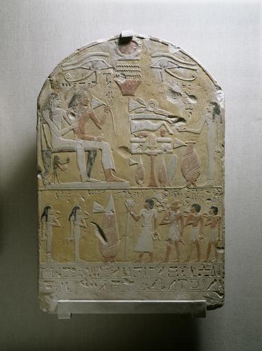 Keywords: Egyptian - Funerary Stele of Tembu - Walters 2292.jpg This round topped funerary stela of Tembu is carved in very low relief and brightly painted in red yellow blue and black The decoration comprises of two registers of offering scenes and a register of inscription on the bottom The top depicts two Wadjit eyes flanking a shen-ring and water ripples with a bowl Below this Tembu is seated with his wife on a typical 18th-Dynasty double chair Under the chair and attached to it by a leash is a pet monkey holding a mirror and a cosmetic vase which is a typical feature of New Kingdom stelae The table in front of the couple holds loosely arranged offerings of bread beef vegetables and lotus buds and two jugs on stands below the table One of the daughters of the couple stands in front of the large wine jar decorated with a nymphaea caerulea and presents a bowl of wine to her parents The middle register depicts the rest of the family including Tembu's sons Teti Tetimose Teiy and Ahmose holding various flowers and two daughters Senetnefer and Henut holding flowers Three of the sons wear short military shendyt in accordance with their titles while the fourth son wears a long shendyt and a shirt Between the daughters and the sons is placed an extremely large jar decorated with a lotus flower and topped with a clay stopper ca 1500 1470 BC New Kingdom limestone with polychrome paint cm 68 45 12 accession number 22 92 12046 Henry Walters Baltimore date and mode of acquisition unknown Walters Art Museum Henry Walters Acquired by Henry Walters Translation His daughter Mahu; Superintendent Tembu; His wife mistress of the house Taneane t ; His daughter Senetnefer; His daughter Henut; His son captain Teti; His son captain of the ship Tetimes; His son captain Teiy; His son herdsman Ahmose; An offering which the king gives to Osiris lord of Busiris Great god lord of Abydos that he may give invocation offerings of oxen fowl and every good and pure thing on which the god lives to the Ka of the superintendent Tembu his wife mistress of the house Tanene t repeating life mistress of honor Highlights from the Collection The Walters Art Gallery Baltimore 1998-2001 place of origin Western Thebes Egypt Walters Art Museum license Ancient Egyptian reliefs in the Walters Art Museum Wine in ancient Egypt Shen ring steles Monkeys in Ancient Egypt Media contributed by the Walters Art Museum needs category review Ancient Egyptian art from Theban Necropolis |