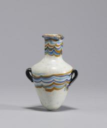 Keywords: Egyptian - Glass Vessel with Handles - Walters 4731.jpg In addition to its use in jewelry amulets inlays and architectural decoration glass was used for vessels particularly distinctively shaped perfume bottles The two most common shapes take their names from Greek pottery amphoriskoi little amphoras and krateriskoi little kraters This vessel is an example of the former with its broad shoulders rounded base and opaque white ground It is a core-formed vessel; the technology of blown glass was as of yet unknown The molten mass composed of silica and natron heated to a temperature of around 1000°-1150° C was wrapped around a clay or dung core that was later removed Decorative bands were formed by pressing threads of colored glass onto the molten surface; combing the threads with a metal tool created decorative patterns ca 1450 1350 BC New Kingdom glass cm 11 4 7 8 5 9 accession number 47 31 28178 F G Hilton Price Sale London 1897 Dikran Kelekian Paris and New York date and mode of acquisition unknown Henry Walters city Baltimore Walters Art Museum Henry Walters Acquired by Henry Walters 1912 3000 Years of Glass Treasures from The Walters Art Gallery The Walters Art Gallery Baltimore 1982 place of origin Dra abu l Naga present-day Western Thebes Egypt Walters Art Museum license Ancient Egyptian pottery in the Walters Art Museum Ancient Egypt amphoriskoi Ancient Egyptian glassware Works of the Egyptian New Kingdom |