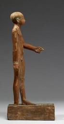 | Keywords: Egyptian - Imti Standing - Walters 2224 - Right Side.jpg Patrons occasionally commissioned sculptors to show them at a particular time of life Imti is represented as a youth with close-cropped hair A necklace of alternating white and black beads with amulet and a blue bracelet bordered in white and black adorn his otherwise nude body Nudity may also suggest rebirth into the afterlife Typical of wooden statues the arms and front of the feet were carved separately and attached to the body or base with pegs The boy is depicted striding with his left foot forward His right arm is at his side and his left arm is bent forward to hold a staff which is missing The head is shaven and the hairline and hair tufts are represented by a black line and black points respectively The whole figure is covered with a thin layer of red-brown paint chipped off in many pieces The finger-nails are painted white and two black dots above the buttocks indicate dimples The base is red with a black top and is incised with hieroglyphs filled in with white The inscription on the base names the owner of the statue The arms are inset and fastened with wooden nails The feet are made separately and are fastened to the base with wooden nails ca 1900 1800 BC Middle Kingdom carved wood polychromy cm 36 8 15 5 accession number 22 24 6613 Dikran Kelekian New York and Paris Henry Walters city Baltimore Walters Art Museum Henry Walters Acquired by Henry Walters 1917 Translation Revered before Osiris Imti the blessed place of origin Egypt Walters Art Museum license Ancient Egyptian statues in the Walters Art Museum |