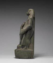 | Keywords: Egyptian - Iret-horru with Osiris - Walters 22215 - Left.jpg In ancient Egypt political upheavals accompanied by changes in religious practices were often an occasion for innovations in private sculpture This was especially evident in the early 18th Dynasty when new statue types representing the donor holding a naos or a sistrum among other objects came into use for the first time The representation of a donor depicted standing seated kneeling or squatting proffering the figure of a deity or a sacred object ensured the donor's eternal participation in the rituals undertaken in the gods' presence Representations of the ritual interaction between men and gods were even more highly sought when the high priests of Amun seized power in Thebes during in the 21st Dynasty and ruled the country's south From this point onward over a period of several centuries statues depicting the donor squatting or holding the image of a god were almost the only statue types dedicated in extraordinary numbers in the temple of Amun at Karnak The vast extent of these dedications was attested early in the 20th century when the French architect Georges Legrain discovered a cache of nearly eight hundred stone statues and seventeen thousand bronzes as well as other artifacts buried in the courtyard of the temple of Amun in front of the 7th pylon The standing figure of the priest Iret-horru was one of these statues-the largest Egyptian statue hoard ever recorded-ritually buried by temple priests in the Ptolemaic period to relieve the crowding of more than two thousand years of private offerings Iret-horru holds the mummified figure of Osiris the god of the netherworld outfitted in his traditional regalia the tall Atef-crown and crook and flail The priest himself wears a wide wig with narrow striations and ankle-length pleated garment with a prominent trapezoidal apron The frontal view exhibits a prominent collarbone and an articulated sternum Despite its awkward proportions the arms in particular are clumsily rendered the statue has a majestic appearance Statues of donors bearing figures of Osiris were among the most popular types of private statuary in the Late Period; this example was dedicated to Iret-horru by his son Necho who also served as a priest in Karnak ca 595 BC Late Period graywacke cm 56 16 accession number 22 215 6796 Sale Egyptian Museum Cairo JE 37890 Dikran Kelekian New York and Paris Henry Walters city Baltimore Walters Art Museum Henry Walters Acquired by Henry Walters 1911 In the Fullness of Time Masterpieces of Egyptian Art from American Collections Hallie Ford Museum of Art Willamette University Salem; Boise Museum of Art Boise 2002-2003 place of origin Egypt Walters Art Museum license Ancient Egyptian statues in the Walters Art Museum Statues of the 21st dynasty of Egypt Media contributed by the Walters Art Museum needs category review Statues from Karnak temple complex Ancient Egyptian priests Ancient Egyptian art made from greywacke |