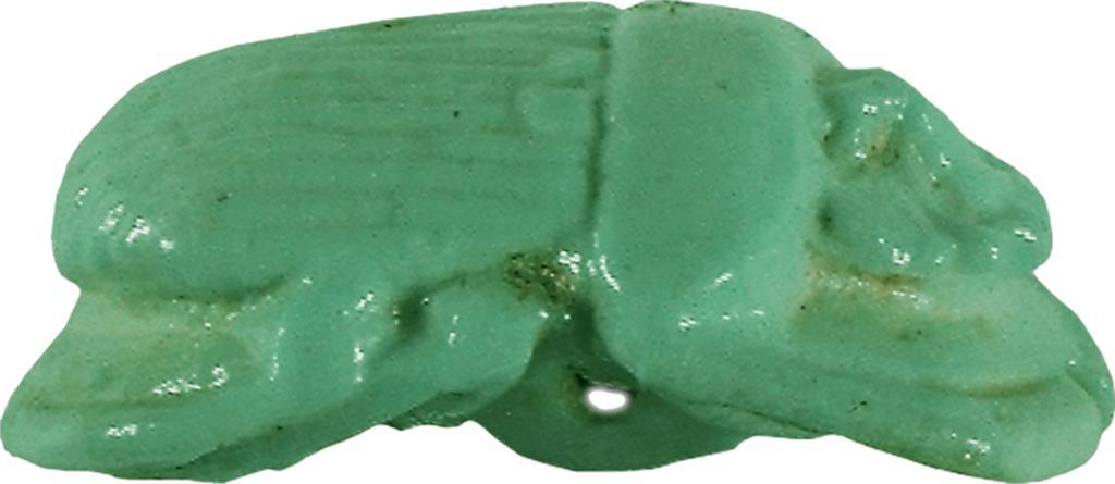 Keywords: Egyptian - Naturalistic Scarab - Walters 42371 - Right.jpg The ancient Egyptians believed that the dung beetle the Scarabaeus sacer was one of the manifestations of the sun god Representations of these beetles were used as amulets and for ritual or administrative purposes Naturalistic scarabs such as this were used as part of the amulet set of the mummy They have a naturalistically formed belly and no additional inscriptions or motifs The highest point of the back of this scarab is the pronotum dorsal plate of the prothorax Pronotum and elytron wing cases are separated by a straight incised partition line; the wing cases have a vertical hatch line pattern nine lines on each side a central division line which ends V-shaped in a scutellum and U-shaped shoulder marks The proportions of the top are almost balanced but the pronotum is short in comparison to the elytron The triangular head is flanked by very small quarter-spherical eyes which protrude from the head; the side platesare irregularly trapezoidal and have hatch lines and clypeus front plate is four times serrated The detailed modeled extremities are slender and have natural form; central notches are at both side edges as well as the top and bottom edges The body structures of the bottom is modeled and a quarter-oval eye protrudes from the center of the belly The basic form of the scarab is long rectangular-oval The scarab is a funerary amulet with regenerative function and was attached to the mummy bandages between 664 525 BC Late Period light beige faience with light green glaze cm 1 1 5 2 3 accession number 42 371 38428 Henry Walters Baltimore date and mode of acquistiion unknown Walters Art Museum Henry Walters Acquired by Henry Walters place of origin Egypt Walters Art Museum license Ancient Egyptian scarabs in the Walters Art Museum Media contributed by the Walters Art Museum needs category review |