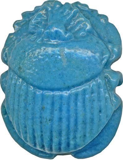 | Keywords: Egyptian - Naturalistic Scarab - Walters 42365 - Back.jpg The ancient Egyptians believed that the dung beetle the Scarabaeus sacer was one of the manifestations of the sun god Representations of these beetles were used as amulets and for ritual or administrative purposes Naturalistic scarabs such as this were used as part of the amulet set of the mummy They have a naturalistically formed belly and no additional inscriptions or motifs The back of this example is very high and the highest point is the pronotum dorsal plate of the prothorax Pronotum and elytron wing cases are separated by a curved incised partition line and the wing cases by a vertical hatch line pattern The quarter-spherical head is flanked by quarter-spherical eyes that protrude from the head; the trapezoidal side plates are decorated with hatch lines and clypeus has four frontal serrations The proportions of the top are slightly unbalanced the head is small in comparison to plates and clypeus and the pronotum is large in comparison to the elytron The modeled extremities have natural form and hatch notches on the frontlegs for the tibial teeth Two notches are at both side edges and one at the front and rear edge The bottom is naturally formed and an eye protrudes from the center of the belly The bottom structure is standardized and the extremities visible; the round eye with horizontal drill-hole is big and protrudes completely from the body of the beetle The basic form of the scarab is round-oval The scarab is funerary amulet with regenerative function which was attached to mummy bandages between 664 525 BC Late Period light beige faience with blue glaze cm 1 2 1 7 2 2 accession number 42 365 17658 Henry Walters Baltimore date and mode of acquisition unknown Walters Art Museum Henry Walters Acquired by Henry Walters Faience The Colors of the Heavens The Walters Art Museum Baltimore; The Walters Art Museum Baltimore 2003-2004 place of origin Egypt Walters Art Museum license Ancient Egyptian scarabs in the Walters Art Museum Media contributed by the Walters Art Museum needs category review |