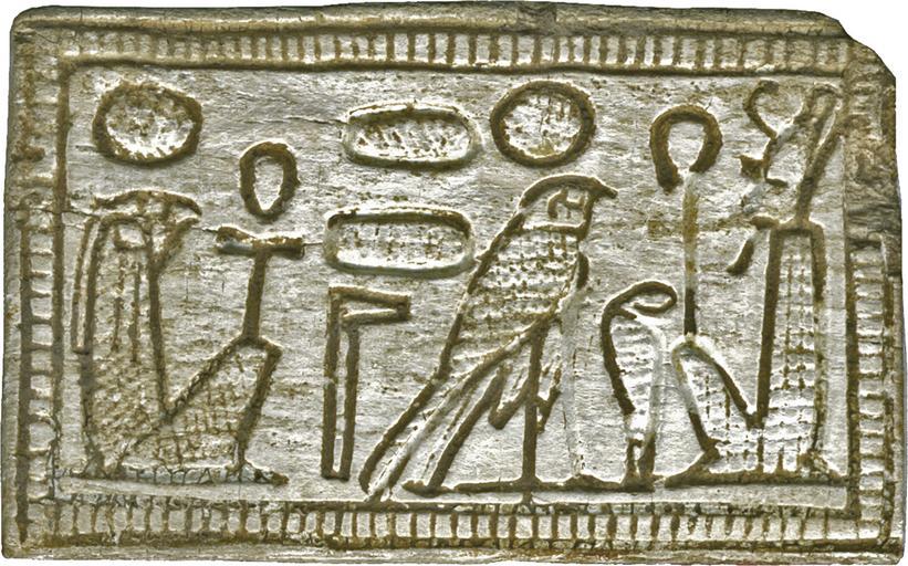 Keywords: Egyptian - Pectoral with Solar Boat - Walters 42378 - Back.jpg This steatite plaque was used as a small pectoral The front is carved in relief depicting the solar boat with two standing baboons in worshipping gesture flanking the winged scarab as well as the moon crescent and disk combination Incised on the back is a scene in which the god Re-Harakhte is seated as falcon-headed deity and as a solar falcon on the left and including the center; opposite of them is Atum the creator god between 1292 945 BC New Kingdom-Third Intermediate steatite cm 2 71 4 67 0 31 accession number 42 378 5288 Maurice Nahman Cairo date and mode of acquisition unknown Henry Walters city Baltimore Walters Art Museum Henry Walters Acquired by Henry Walters 1930 Jewelry - Ancient to Modern The Walters Art Gallery Baltimore 1979-1980 place of origin Egypt Walters Art Museum license Atum Ra-Horakhty Ancient Egyptian pectorals in the Walters Art Museum Media contributed by the Walters Art Museum needs category review Heliopolis Egypt |