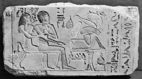 Keywords: Egyptian - Relief with Husband and Wife - Walters 22134.jpg The sculptor Mentu-user and his wife Hepu are shown seated before a table heaped with various offerings including a haunch of beef a goose and a bunch of grapes The inscriptions beside their heads identify them Note that the hieroglyphs face in the same direction as the figures The two columns of hieroglyphs on the right are a request to the living to recite the offering text calling for fowl and a thousand loaves of bread for Mentu-user The red flesh tone of the man and the yellow of the woman are an artistic convention to differentiate the sexes ca 2100 2020 BC First Intermediate Period-early Middle Kingdom limestone with paint cm 16 5 29 5 6 accession number 22 134 19382 Dikran Kelekian New York and Paris Henry Walters city Baltimore Walters Art Museum Henry Walters Acquired by Henry Walters 1913 place of origin Naga ed-Dêr in present-day Egypt Walters Art Museum license Ancient Egyptian reliefs in the Walters Art Museum Ancient Egyptian slab steles Media contributed by the Walters Art Museum needs category review |