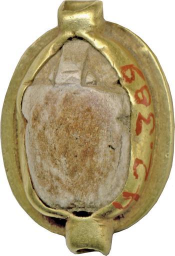 Keywords: Egyptian - Ring Bezel - Walters 42389 - Back.jpg A scarab carved of light brown steatite with a thick gold rim around the bottom edge A lip of gold pressed around the scarab to hold it in place is drawn out to form hoop-sockets Carved into the back of the scarab is a beetle with outstretched legs under a disk ca 1648 1539 BC Second Intermediate; Hyksos steatite with glaze gold cm 0 6 1 3 1 9 accession number 42 389 18790 Henry Walters Baltimore date and mode of acquisition unknown Walters Art Museum Henry Walters Acquired by Henry Walters Kheper-Ra Jewelry - Ancient to Modern The Walters Art Gallery Baltimore 1979-1980 place of origin Egypt Walters Art Museum license Ancient Egyptian scarabs in the Walters Art Museum Ancient Egyptian finger rings in the Walters Art Museum Hyksos scarabs Khepri |