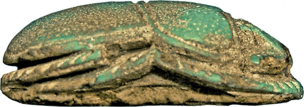 | Keywords: Egyptian - Scarab Amulet - Walters 422 - Right.jpg The ancient Egyptians believed that the dung beetle the Scarabaeus sacer was one of the manifestations of the sun god Representations of these beetles were used as amulets and for ritual or administrative purposes The bottom of this scarab displays a motif that combines the figure of a jackal with nine captives The reclining jackal's head is raised and his tail hanging down Below his body are nine prisoners in three rows depicted; they are kneeling on the ground with their arms fettered behind their backs The jackal is the dominant icon in the composition according to his size and superior position The slim figures of the prisoners are not intended to represent individual persons but a group; all have the same posture and are placed in a symmetrical order; only the position of the fettered arms shows minor variations An oval line frames the motif The highest point of the back is the pronotum dorsal plate of the prothorax Pronotum and elytron wing cases have incised borderlines a double curved partition line and one division line between the wing cases with a scutellum small central triangle at the upper end The semicircular head is flanked by quarter-ovoid eyes; the side plates are quarter-circular and the clypeus front plate has two central base notches The raised extremities have natural form as well as diagonal hindlegs and vertical frontlegs hatch notches on the upper sides for tibial teeth and pilosity hair The proportions of the top are slightly unbalanced the elytron short and the clypeus and plates very large in comparison to the small head The base has a symmetrical long-oval shape The scarab is longitudinally pierced was originally mounted or threaded and used as an institutional funerary amulet The motif on the bottom represents the administrative seal of the Thebes' necropolis but was also used in other cemeteries Nevertheless the faience material makes it doubtful that the scarab was really used as an official seal It seems more likely that the scarab was used as a protective funerary amulet that should guarantee the security of the tomb in this world and be effective against dangers in the afterlife This seal was used since the late 18th Dynasty; comparable seal impressions were found e g in the tomb of king Tutankhamen and a seal matrix made of faience is today in the Myers Museum at the Eton College between 1330 1213 BC New Kingdom faience with green-blue glaze cm 4 8 2 9 1 7 accession number 42 2 3485 Henry Walters Baltimore 1924 mode of acquisition unknown Walters Art Museum Henry Walters Acquired by Henry Walters 1924 place of origin Egypt Walters Art Museum license Ancient Egyptian scarabs in the Walters Art Museum Scarab amulet Media contributed by the Walters Art Museum needs category review |