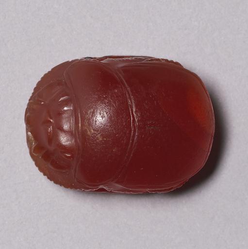 Keywords: Egyptian - Scarab of Neferu-Re - Walters 4256 - Top.jpg The ancient Egyptians believed that the dung beetle the Scarabaeus sacer was one of the manifestations of the sun god Representations of these beetles were used as amulets and for ritual or administrative purposes This small red carnelian scarab has a vertically arranged bottom inscription which consists of three lines of right reading text with a cartouche in the center An oval line frames the inscription The text contains the name and title of crown princess Neferure daughter of the female pharaoh Hatshepsut and a formula whishing her life The highest point of the back is the pronotum dorsal plate of the prothorax Pronotum and elytron wing cases have fine single borderlines and double separations lines The line flow almost regular only the partition lines between pronotum and elytron overlap slightly The trapezoidal head is flanked by quarter-ovoid eyes The trapezoidal side plates have curved outer edges and the clypeus front plate which is very large in comparison to the head has four frontal serrations and a central base notch The extremities show natural form and vertical hatch lines for the tibial teeth and pilosity hair the background between the legs is deeply hollowed out The oval base is symmetrical The scarab is longitudinally pierced and was originally mounted or threaded It functions as a name seal and user-individualized amulet of crown princess Neferure The scarab should secure the individual existence wish formula who may live divine relation title divine consort and royal status cartouche of the crown princess and the red color her magic protection The material carnelian was especially used for protective amulets and the Egyptians believed that it would intensify the magical potency The scarab could have been a personal amulet of the princess but it is also possible that it was given to a private person to guarantee the crown princess' patronage Scarabs made of dark red carnelian were popular for the female members of the court in early 18th Dynasty between 1479 1458 BC New Kingdom intensive red carnelian cm 1 4 1 1 0 9 accession number 42 56 1633 Henry Walters Baltimore date and mode of acquisition unknown Walters Art Museum Henry Walters Acquired by Henry Walters Translation Name of the crown princess Neferure in a cartouche combined with the priestess title and a wish formula Divine consort / Neferu-Re / who may live place of origin Egypt Walters Art Museum license Ancient Egyptian scarabs in the Walters Art Museum Media contributed by the Walters Art Museum needs category review Scarabs with Wish Formula Neferure |