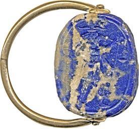 | Keywords: Egyptian - Scarab Ring Bezel - Walters 42151 - Bottom.jpg This lapis lazuli scarab has a hawk-head figure wearing a ram's-horn crown carved into the back In his left hand is a staff from which a lotus blossom dangles century 4 BC Late Period-early Greco-Roman lapis lazuli modern gold mount cm 1 1 1 7 2 1 ; Max outer Diam cm 2 4 ; Max inner Diam cm 2 15 accession number 42 151 35459 H Hoffmann Collection until 1899 mode of acquisition unknown Charles Newton-Robinson London date and mode of acquisition unknown Charles Newton-Robinson Sale Christie Manson and Woods London June 22 1909 lot 1 Dikran Kelekian Paris and New York 1909 by purchase Henry Walters city Baltimore Walters Art Museum Henry Walters Acquired by Henry Walters 1909 Jewelry - Ancient to Modern The Walters Art Gallery Baltimore 1979-1980 place of origin Egypt Walters Art Museum license Ancient Egyptian scarabs in the Walters Art Museum Ancient Egyptian finger rings in the Walters Art Museum Thoth |