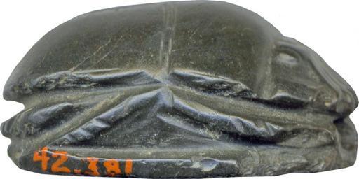 Keywords: Egyptian - Scarab with a King Holding a Captive - Walters 42381 - Right.jpg The ancient Egyptians believed that the dung beetle the Scarabaeus sacer was one of the manifestations of the sun god Representations of these beetles were used as amulets and for ritual or administrative purposes The bottom of this scarab displays a motif which shows King Ramesses II smiting an enemy The king grabs the captive with one hand by his hair and swings back his sickle-sword with the other The vehemence of the movement is supported by his striding posture having the front foot on the ground but the heal of the back foot lifted The captive's lower body faces to the right his head and raised arms turned towards the king in a capitulation gesture Ramesses II wears a knee length shendyt and the so-called Blue crown with Uraeus-serpent and long crown sash; a sun disc flanked by two Uraei cobras is above his head It is notable that the sword and the sun disk appear together in the top of the text field The captive is dressed in a calf length shendyt and has a Nubian hairstyle The lower round below a horizontal scene divider displays the unification icon with papyrus and lotus plants combined with two kneeling fettered captives a Nubian left and a Libyan with a feather in his hair right The inscription in front of the king contains his throne name behind his back is an epithet and between his legs an nb-basket The figure of the king dominates the upper register by its size and movement - conveying victorious power The turned position of the captive with raised arms the slightly bent upper body and the small step with one raised foot demonstrates insecurity The arrangement of the hieroglyphs as well as the baseline with the unification icon below creates a frame which conveys a solar earthly and royal dimension The back of the scarab is flat and pronotum dorsal plate of the prothorax its highest point Pronotum and elytron wing cases have double separation lines The head section consists of a semicircular head flanked by quarter-spherical eyes trapezoidal side plates and a four times serrated clypeus front plate The slender extremities have natural form with some diagonal hatch lines on the ends of the legs for the tibial teeth and pilosity hair The oval base is symmetrical The scarab is longitudinally pierced was originally mounted or threaded and functioned as an amulet It should secure the presence and victorious power of the king and provides a private owner with his royal patronage and protection The high quality of the piece makes it likely that it was produced and used in the royal court One can speculate if such scarabs were distributed to high officials especially in the military The motif of the unification icon with fettered captives appears also on a scarab in the Pushkin Museum no 2338 displaying Ramesses II seated on a Sed-festival throne or litter accompanied by Month and Seth; the name of Ramesses is also written without cartouche It is likely that both scarabs belong to a series between 1279 1213 BC New Kingdom black serpentine cm 1 4 2 2 8 accession number 42 381 37798 Henry Walters Baltimore date and mode of acquisition unknown Walters Art Museum Henry Walters Acquired by Henry Walters Translation Throne name of King Ramesses II combined with powerful epithets User-Maat-Re setep-en-Re; / Victorious King ; / Lord of Strength place of origin Egypt Walters Art Museum license Ancient Egyptian scarabs in the Walters Art Museum Media contributed by the Walters Art Museum needs category review POWs in Ancient Egypt |
