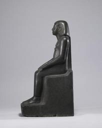 Keywords: Egyptian - Seated Figure of Nefer-hotep - Walters 22214 - Left.jpg This statue is of a non-royal seated man with hands held flat against his thighs The face is triangular with modeled brows The eyes are set into shallow narrow sockets The lids of the eyes are indicated by two modeled ridges Sculpture patrons of the Middle Kingdom favored the use of hard dark stones and compact block-like forms to insure the long-term survival of their statues The texts on the front of the shendyt and on the sides of the seat request offerings and record Neferhotep's name and titles as well as his parentage The deity invoked to secure the offerings is the deceased king who founded the Middle Kingdom Nebhepetre Mentuhotep II 11th Dynasty ca 1750 1700 BC Second Intermediate granodiorite cm 53 15 29 accession number 22 214 27934 Giovanni Dattari Cairo Dattari Collection Sale Hôtel Drouot Paris 1912 no 294 pl XXVIII Henry Walters city Baltimore Walters Art Museum 1931 by bequest Acquired by Henry Walters 1912 Inscription place of origin Egypt Walters Art Museum license Ancient Egyptian statues in the Walters Art Museum Statues of the Egyptian second intermediate period |