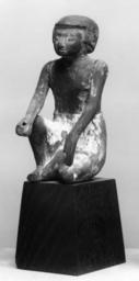 | Keywords: Egyptian - Seated Servant - Walters 2217 - Three Quarter.jpg This carved seated figure has his riht knee raised with his left foot pressed against his right His right hand is forward and has a hole to receive an object His arms are joined with wood pins His flesh is red his skirt white and his hair eyes and beard are black date Middle Kingdom wood with red white and black paint cm 15 2 accession number 22 17 35383 Dikran Kelekian New York and Paris date and mode of acquisition unknown Henry Walters city Baltimore Walters Art Museum Henry Walters Acquired by Henry Walters 1914 Label Old label XII dynasty Found at Assiout place of origin Assiout Egypt Walters Art Museum license Ancient Egyptian statues in the Walters Art Museum Statues of the 12th dynasty of Egypt Ancient Egyptian art from Asyut Black and white photographs of statues |