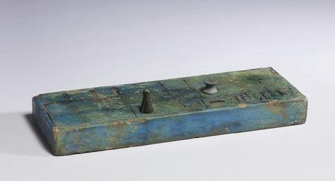 Keywords: Egyptian - "Senet" Board - Walters 48408 - Three Quarter.jpg Egyptians enjoyed playing board games especially senet or passing During the 18th dynasty the game acquired religious significance which transformed it into a simulation of the soul's journey through the underworld to achieve immortality Throw sticks much like dice determined a player's moves and winning required both skill and luck This senet game board of 30 squares required 14 game pieces like these spool- and cone-shaped pieces between 1307 1070 BC New Kingdom Egyptian faience with glaze cm 26 5 9 1 accession number 48 408 1369 Rev William MacGregor Collection Sale Sotheby's London 1922 no 263 Dikran Kelekian Paris and New York Henry Walters city Baltimore Walters Art Museum Henry Walters Acquired by Henry Walters 1923 Translation First of the Priests of Amun One who is in the place of the Temple of Amun-Ré an acolyte of Amun-Ré King of the gods Nesi-amun-ipet the Justified of Voice the gift of Amun himself place of origin Abydos present-day El Balyana Egypt Walters Art Museum license Ancient Egyptian art in the Walters Art Museum Ancient Egyptian faience in the Walters Art Museum Senet board game Works of the Egyptian New Kingdom |