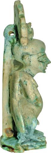 | Keywords: Egyptian - Standing Pataikos - Walters 481616 - Right.jpg This dwarf-like protective deity was very popular in ancient Egypt; amulets in the shape of this god were particularly popular from the Third Intermediate period The Greek name Pataikos comes from a passage in the writings of Herodotus ca 5th century BC who used this term to describe a Phoenician protective dwarf-like image The Egyptian Pataikos is a special manifestation of the creator god Ptah and the dwarf-like appearance symbolizes his magical power This Pataikos is standing on crocodiles and has knives in his hands A large collar adorns his neck and upper chest The crown is quite unusual for Pataikos; it is an atef crown combination of the Upper Egyptian crown with flanking plumes flanked by sun-disk-crowned snakes A scarab usually on top of the head of Pataikos is instead placed in front of the lower center of the crown Wings are attached behind the shoulders of the god The back pillar is pierced to function as a loop for a pendant This was probably made during the Ptolemaic Period century 3 2 BC Greco-Roman Egyptian faience with blue-green glaze cm 6 1 2 3 1 5 accession number 48 1616 19584 Henry Walters Baltimore date and mode of acquisition unknown Walters Art Museum Henry Walters Acquired by Henry Walters Daily Magic in Ancient Egypt The Walters Art Museum Baltimore 2006-2007 place of origin Egypt Walters Art Museum license Ancient Egyptian amulets in the Walters Art Museum Ancient Egyptian faience in the Walters Art Museum Pataikos |