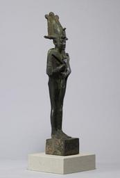| Keywords: Egyptian - Statue of Osiris - Walters 54551 - Three Quarter Right.jpg The god of resurrection Osiris reigned supreme in the underworld He combined the elements of death regeneration and fertility in his mythology He was also connected with crops and the annual floods Osiris took on funerary associations when he was linked with other underworld gods as his cult spread across the land This combination of fertility and funerary aspects made Osiris the principal god of the dead One of his titles is chief of the westerners the west being the domain of the dead Here the god is shown in his standard iconography attired in a mummiform garment his hands projecting from the wrappings to hold the royal insignia of crook and flail He wears the elaborate atef crown-composed of the tall white crown double plumes ram horns and uraeus sacred cobra -as well as a ceremonial braided beard This statue is of extraordinary size ca 580 550 BC Late Period hollow cast bronze cm 60 96 14 accession number 54 551 36613 Dikran Kelekian New York and Paris date and mode of acquisition unknown Henry Walters city Baltimore Walters Art Museum Henry Walters Acquired by Henry Walters 1914 place of origin Upper Egypt Walters Art Museum license Ancient Egyptian statues in the Walters Art Museum Statues of Osiris Statues of the Egyptian late period Braided beards |