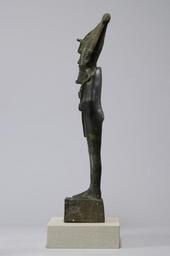 | Keywords: Egyptian - Statue of Osiris - Walters 54551 - Left Profile.jpg The god of resurrection Osiris reigned supreme in the underworld He combined the elements of death regeneration and fertility in his mythology He was also connected with crops and the annual floods Osiris took on funerary associations when he was linked with other underworld gods as his cult spread across the land This combination of fertility and funerary aspects made Osiris the principal god of the dead One of his titles is chief of the westerners the west being the domain of the dead Here the god is shown in his standard iconography attired in a mummiform garment his hands projecting from the wrappings to hold the royal insignia of crook and flail He wears the elaborate atef crown-composed of the tall white crown double plumes ram horns and uraeus sacred cobra -as well as a ceremonial braided beard This statue is of extraordinary size ca 580 550 BC Late Period hollow cast bronze cm 60 96 14 accession number 54 551 36613 Dikran Kelekian New York and Paris date and mode of acquisition unknown Henry Walters city Baltimore Walters Art Museum Henry Walters Acquired by Henry Walters 1914 place of origin Upper Egypt Walters Art Museum license Ancient Egyptian statues in the Walters Art Museum Statues of the Egyptian late period Statues of Osiris Braided beards |