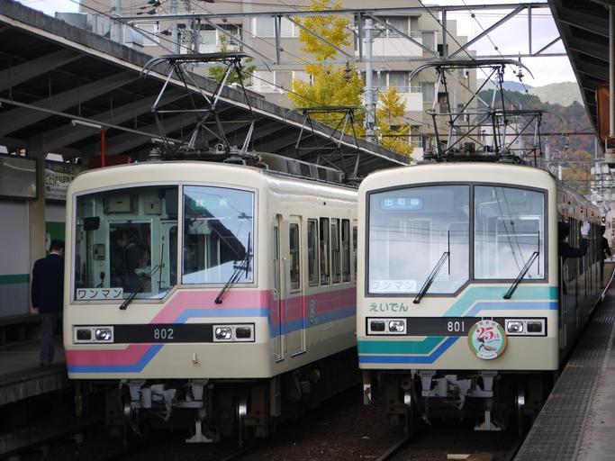 Keywords: Eiden 801 and 802.JPG ja 修学院駅で並ぶ叡山電鉄801と802 en Eizan Electric Railway 801 and 802 stop at Shugakuin station 2014-11-23 12 23 02 own Hahifuheho other versions cc-zero Uploaded with UploadWizard Eizan Electric Railway series Deo 800