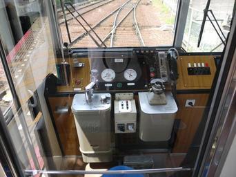 Keywords: Eiden 851 cabin 20140723.JPG ja 叡電851の運転席 この編成だけ 目調 en Eiden 851 cabin This unit has wooden textured panel 2014-07-23 13 26 28 own Hahifuheho cc-zero Uploaded with UploadWizard Eizan Electric Railway series Deo 800