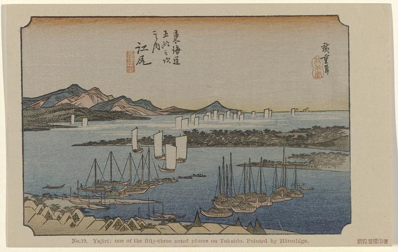 Keywords: Eijiri-Rijksmuseum RP-P-2010-310-95-19.jpeg accession number RP-P-2010-310-95-19 Utagawa died 1858; Fujisawa Bunjirô Fujisawa BunjirôHiroshige I credit line nl De haven bij de uitmonding van de Okitsu rivier met in de verte zeilbootjes Label Line mentioned on object Hiroshige I Utagawa 1797 - 1858 1906 kleurenhoutsnede; lijnblok in zwart met kleurblokken Collection prenten; Japan collectie kaart Height mm 90 kaart Width mm 141 exhibition history cardboard object history Acquisition 2009-10-13 object type PD-US PD-old Data and photography rights All data and all images made available through the API are either in the public domain or are subject to a CC0 license https //www rijksmuseum nl/en/api/terms-and-conditions-of-use cc-zero place of creation Japan http //www rijksmuseum nl/collectie/RP-P-2010-310-95-19 http //hdl handle net/10934/RM0001 COLLECT 490388 handle Eijiri Uploaded with GWToolset Rijksmuseum RP-P-2010-310-95-19 http //www rijksmuseum nl/media/assets/RP-P-2010-310-95-19 Images uploaded by Fæ Japanese 20th-century prints in the Rijksmuseum Amsterdam Images from the Rijksmuseum |