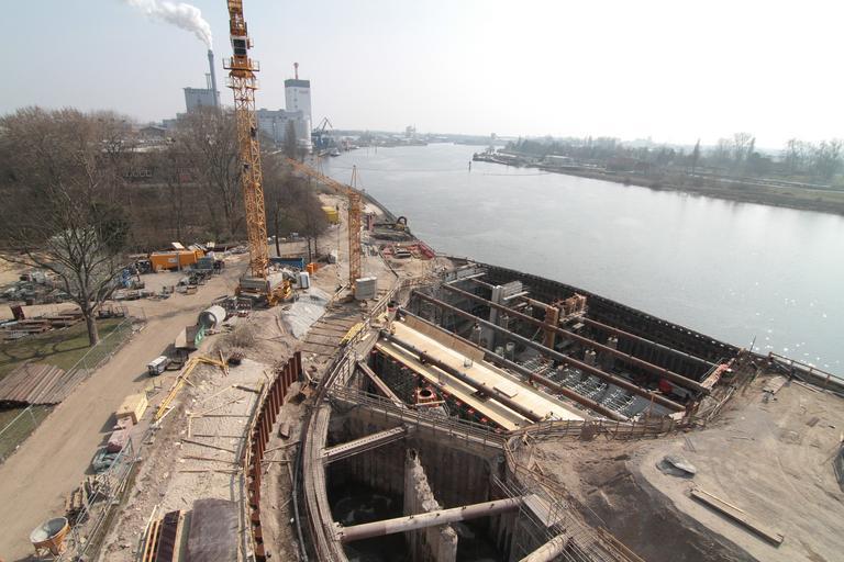 Keywords: Einlaufbauwerk Baustelle Weserkraftwerk.JPG en View on the construction site of the inlet scruture of the hydroelectric power plant on the river Weser in Bremen Germany de Blick auf das im Bau befindliche Einlaufbauwerk des Weserkraftwerks Bremen own Florean Fortescue 2011-03-30 Inlet scruture of the hydroelectric power plant in Bremen Cc-zero |