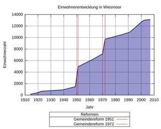 | Keywords: Einwohner-wiesmoor-2007.svg  Entwicklung der Einwohnerzahl von Wiesmoor von 1910-2007 own MyName A1000 <span class signature-talk >talk</span> Cc-zero Gnuplot script to generate this plot gnuplot <source lang gnuplot > /usr/bin/gnuplot gnuplot 4 2 set terminal svg set output Einwohner-wiesmoor-2007 svg unset key set style data lines set style fill solid 0 4 set grid set xlabel 'Jahr' set ylabel 'Einwohnerzahl' set title 'Einwohnerentwicklung in Wiesmoor' set key outside bottom center box title 'Reformen' width 10 plot '-' with filledcurves below x1 lt rgb 'dark-blue' lw 2 notitle \ - using 1 14000 with impulses lt 1 lw 1 title 'Gemeindereform 1951' \ - using 1 14000 with impulses lt 1 lw 1 title 'Gemeindereform 1972' 1914 151 1919 383 1923 686 1939 905 1949 1474 1951 4927 1963 6276 1970 7177 1972 9724 1985 10505 1991 10922 1996 11874 2001 12875 2003 13039 2007 13128 e 1951 e 1972 e </source> Gnuplot diagrams Wiesmoor |