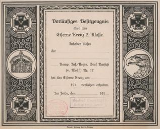 | Keywords: Eisernes Kreuz Besitzzeugnis.jpg ru Свидетельство о в учении О дена Железного К еста 2-й степени de Vorläufiges Besitzzeugnis über das Eiserne Kreuz 2 Klasse 1915 http //erster-weltkrieg dnb de/WKI/Web/DE/Navigation/Krieg-ausstellen/Sachsen-im-Feld/sachsen-im-feld html Deutsche Nationalbibliothek other versions Custom license marker 2014 11 14 PD-Old Uploaded with UploadWizard Iron Cross 1914 | ||||