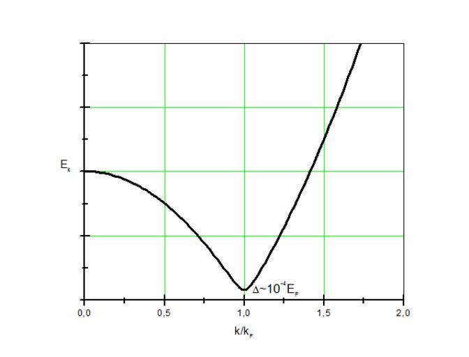 | Keywords: Ek superconductor (teoría BCS).png es E<sub>k</sub> es en el marco de la teoría BCS la diferencia de energía entre un sistema en que todos los electrones están en estado superconductor formando pares de Cooper que sería el estado fundamental y ese mismo sistema con un único electrón desapareado en el estado k que es el primer estado excitado Puede parecer que en principio si un par de Cooper se rompe deberíamos tener como mínimo dos electrones desapareados; sin embargo si consideramos un sistema que permite intercambio de partículas la excitación más baja posible corresponde a la de un único electrón desapareado y no dos k/kF es la razón entre el momento de dicha partícula y el momento de Fermi Δ es la banda prohibida superconductora que es la energía mínima que necesita un electrón para pasar al estado normal Si la que recibe un electrón apareado es inferior a Δ este no tendrá ninguna posibilidad de pasar al estado normal La función se ha realizado por aplicación directa de la función <math>f x \sqrt x 2-1 2-0 08 2 </math> que pretende emular mediante constantes arbitrarias el comportamiento de <math>E_k \sqrt \epsilon_k 2+\Delta 2 </math> donde ε<sub>k</sub> es la energía cinética sobre el nivel de Fermi de una partícula de momento k <math>\epsilon_k \frac \hbar 2 \vec k 2 2m - \epsilon_F \frac \hbar 2 \vec k 2 2m - \frac \hbar 2 \vec k _F 2 2m \epsilon_F\left \vec k / \vec k _F 2-1\right </math> Own 2008-03-24 Eynar Superconductors |
