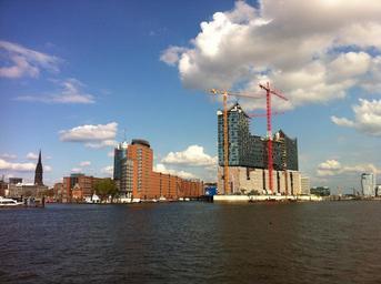 Keywords: elbe water hamburg mirroring river port ship sky germany clouds building city shipping ferry sunny herrlich port city