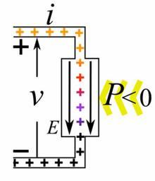 | Keywords: Electric power source animation 2.gif electric power source such as a battery or electric generator or other active component In a power source the electric current i flows into the negative terminal and out of the positive terminal The electric charges are forced to move in the opposite direction to the electric field E in the direction of increasing electric potential gradient Work must be done on the charges to make them move in this direction The potential energy of the charges color is increased so electric power p < 0 flows out of the component into the circuit Therefore the component must have a source of power yellow arrows <br /><br /> In contrast in an electrical load such as a light bulb or electric motor or other passive component the current flows into the positive terminal and out of the negative terminal in the direction of lower potential energy So work is done by the charges on the component and power flows out of the circuit into the component A companion load animation is located at Electric load animation gif 2014-04-05 09 18 03 own Chetvorno cc-zero Uploaded with UploadWizard Negative resistance Electrical power conversion diagrams Animated GIF |
