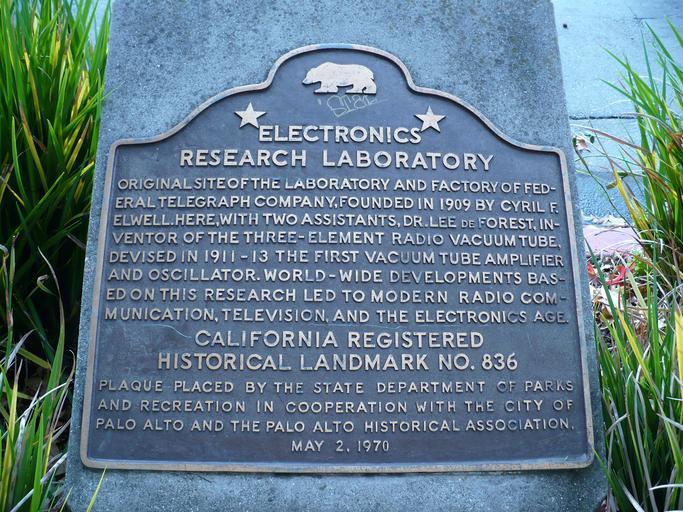 | Keywords: Electronics Research Laboratory plaque.jpg 836 en Photo of wikipedia California Historical Landmark No 836 self self 2008-11-02 37 4415212 -122 1576664 Located at the eastern corner of Channing St and Emerson Ave in Palo Alto California The landmark text raised letters upon bronze embedded upon a frustum reads Bear of California ˜… ˜… ELECTRONICS RESEARCH LABORATORY ORIGINAL SITE OF THE LABORATORY AND FACTORY OF FED- ERAL TELEGRAPH COMPANY FOUNDED IN 1909 BY CYRIL F ELWELL HERE WITH TWO ASSISTANTS DR LEE DE FOREST IN- VENTOR OF THE THREE-ELEMENT RADIO VACUUM TUBE DEVISED IN 1911-13 THE FIRST VACUUM TUBE AMPLIFIER AND OSCILLATOR WORLD-WIDE DEVELOPMENTS BAS- ED ON THIS RESEARCH LED TO MODERN RADIO COM- MUNICATION TELEVISION AND THE ELECTRONICS AGE CALIFORNIA REGISTERED HISTORICAL LANDMARK NO 836 PLAQUE PLACED BY THE STATE DEPARTMENT OF PARKS AND RECREATION IN COOPERATION WITH THE CITY OF PALO ALTO AND THE PALO ALTO HISTORICAL ASSOCIATION MAY 2 1970 Ethics2med original upload log wikitable date/time username resolution size edit summary ---- 07 21 3 November 2008 User Ethics2med <a href http //upload wikimedia org/wikipedia/commons/4/41/CHL_836 jpg ><img alt Thumbnail for version as of 07 21 3 November 2008 src http //upload wikimedia org/wikipedia/commons/thumb/4/41/CHL_836 jpg/120px-CHL_836 jpg width 120 height 90 border 0 /></a></td><td>3 072×2 304 2 54 MB <nowiki> en Photo of <a href http //en wikipedia org/wiki/California_Historical_Landmark class extiw title wikipedia California Historical Landmark >wikipedia California Historical Landmark</a> No 836 self self Nov 2 2008 lat 37 4430918 lon -122 1574008 </nowiki> Lee De Forest Palo Alto California California Historical Landmarks plaques California Historical Landmarks in Santa Clara County California Raised letters |